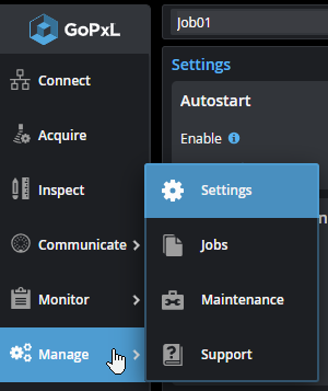 The Support page provides software version information and lets you download a support file for troubleshooting; it also lets you upload a support file to GoPxL. You can also access and download the GoPxL documentation, download the SDK, and go to LMI's online support page. For more information, see Support. |
